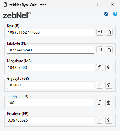 zebNet Byte Calculator is a small tool that allows you to quickly convert between different measurements of bits and bytes.