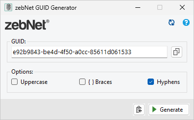 zebNet GUID Generator is a small tool that allows you to generate 128-bit globally unique identifier (GUIDs) also known as universally unique identifier (UUIDs).