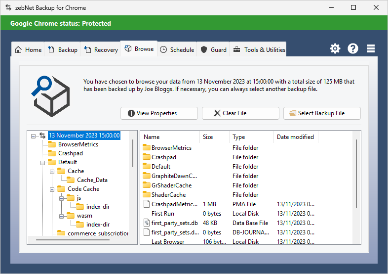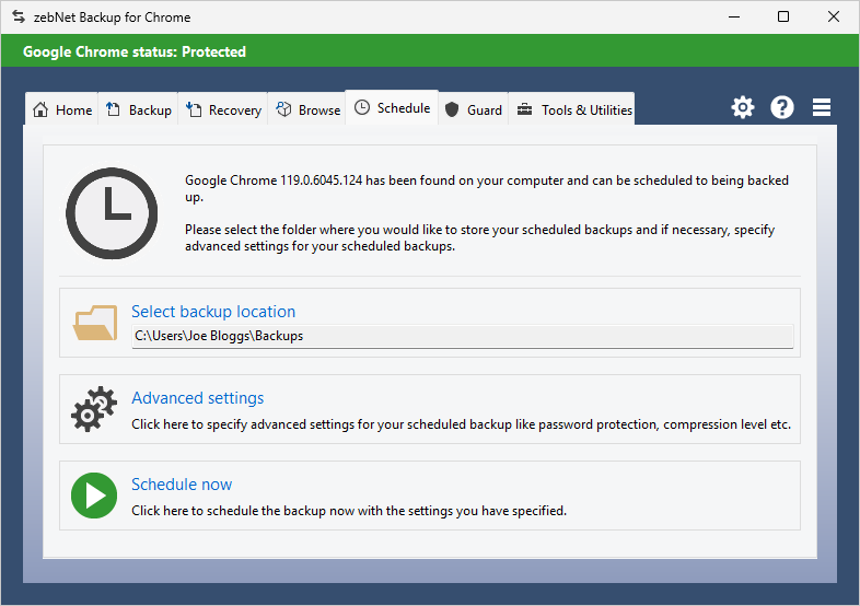 Have a look at the screenshots to get a first impression of what working with zebNet Backup for Chrome looks like. Each image is only a thumbnail and you can click on an image to enlarge it.