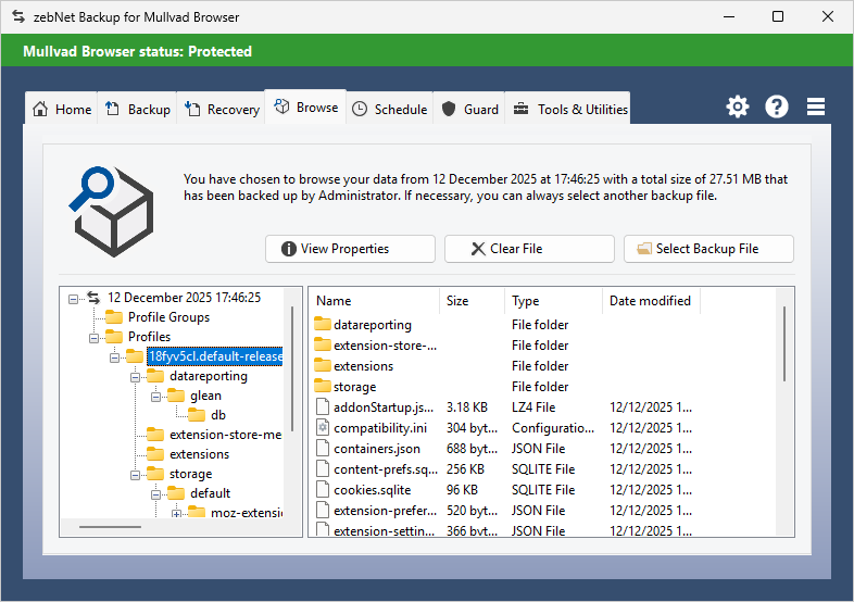 Have a look at the screenshots to get a first impression of what working with zebNet Backup for Mullvad Browser looks like. Each image is only a thumbnail and you can click on an image to enlarge it.