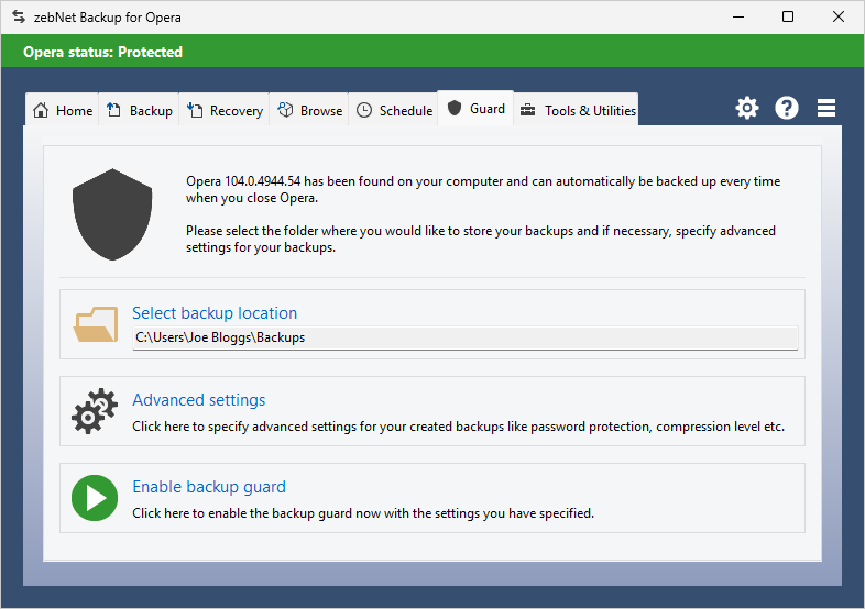 Have a look at the screenshots to get a first impression of what working with zebNet Backup for Opera Browser looks like. Each image is only a thumbnail and you can click on an image to enlarge it.