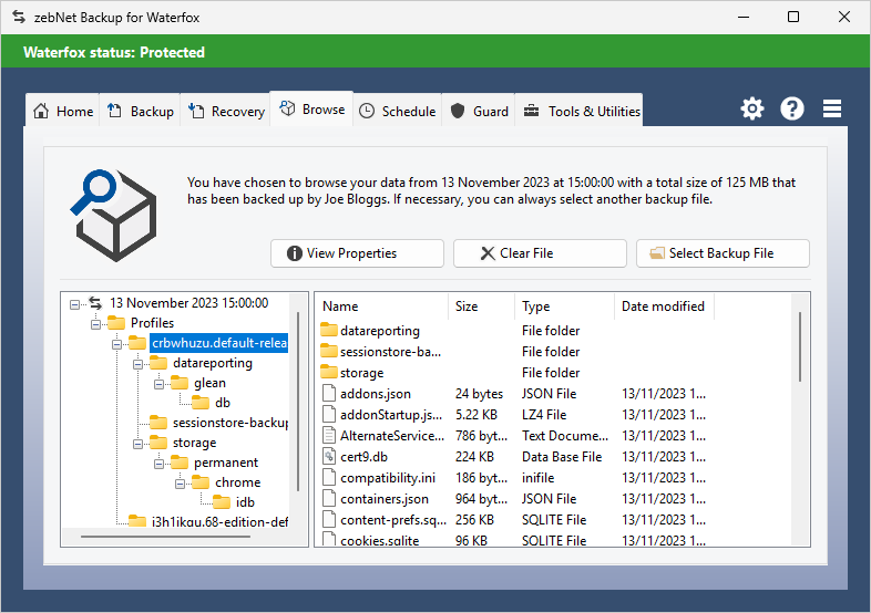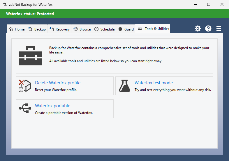 Have a look at the screenshots to get a first impression of what working with zebNet Backup for Waterfox looks like. Each image is only a thumbnail and you can click on an image to enlarge it.
