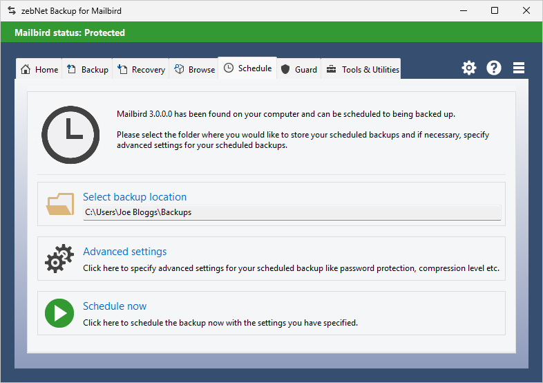Have a look at the screenshots to get a first impression of what working with zebNet Backup for Mailbird looks like. Each image is only a thumbnail and you can click on an image to enlarge it.
