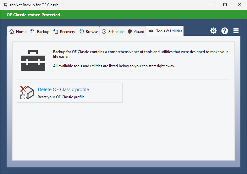 Have a look at the screenshots to get a first impression of what working with zebNet Backup for OE Classic looks like. Each image is only a thumbnail and you can click on an image to enlarge it.
