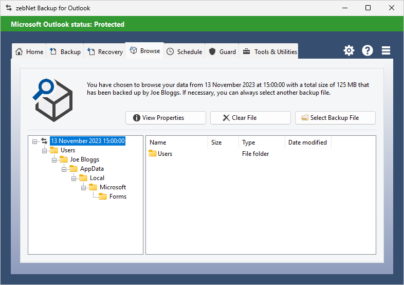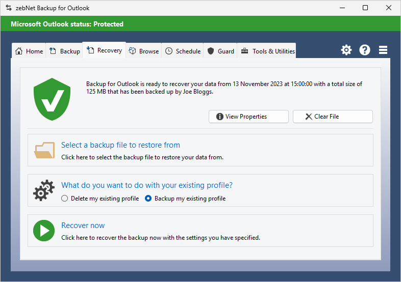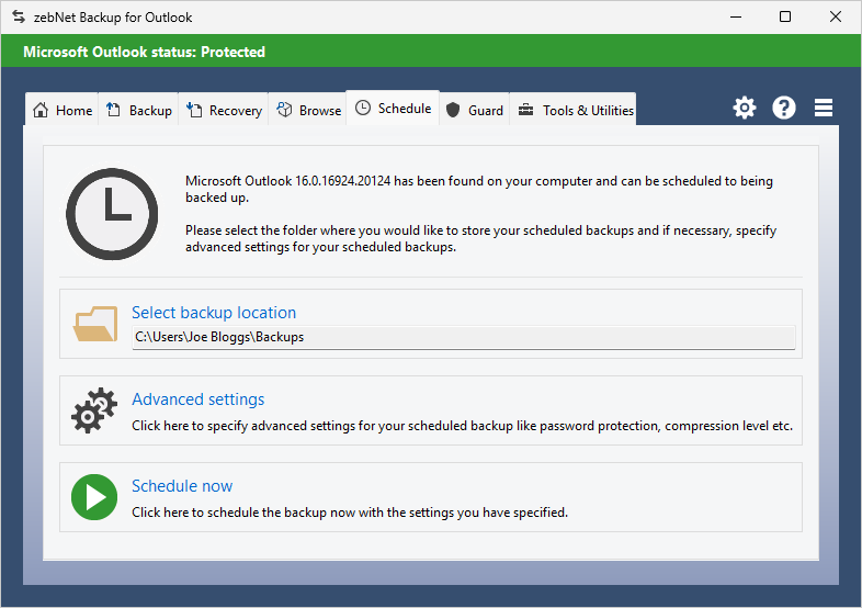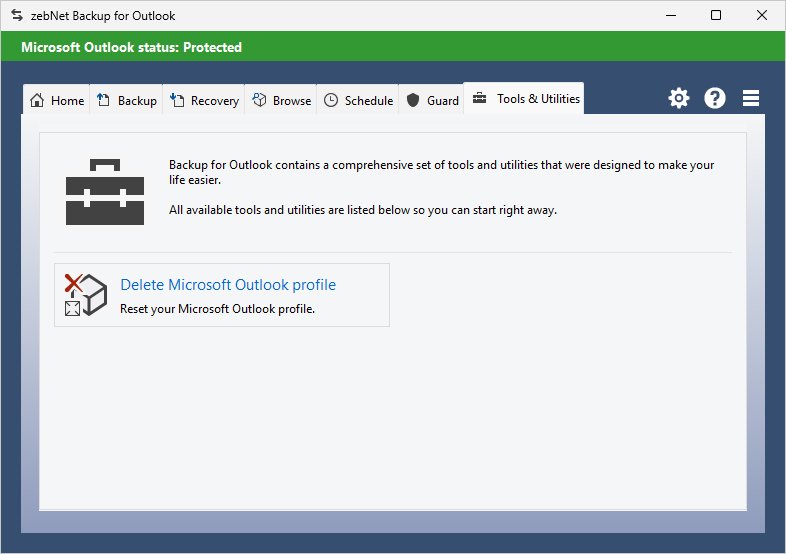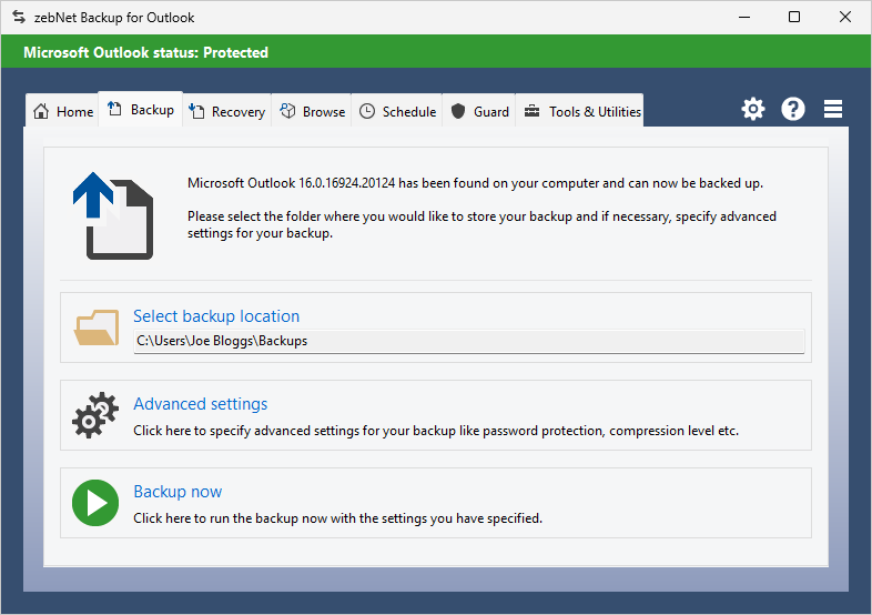 Have a look at the screenshots to get a first impression of what working with zebNet Backup for Outlook looks like. Each image is only a thumbnail and you can click on an image to enlarge it.