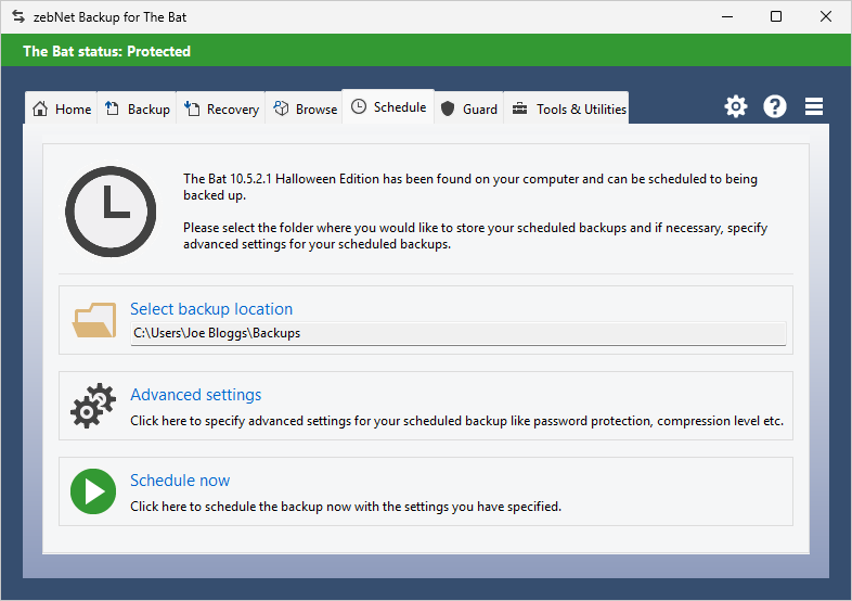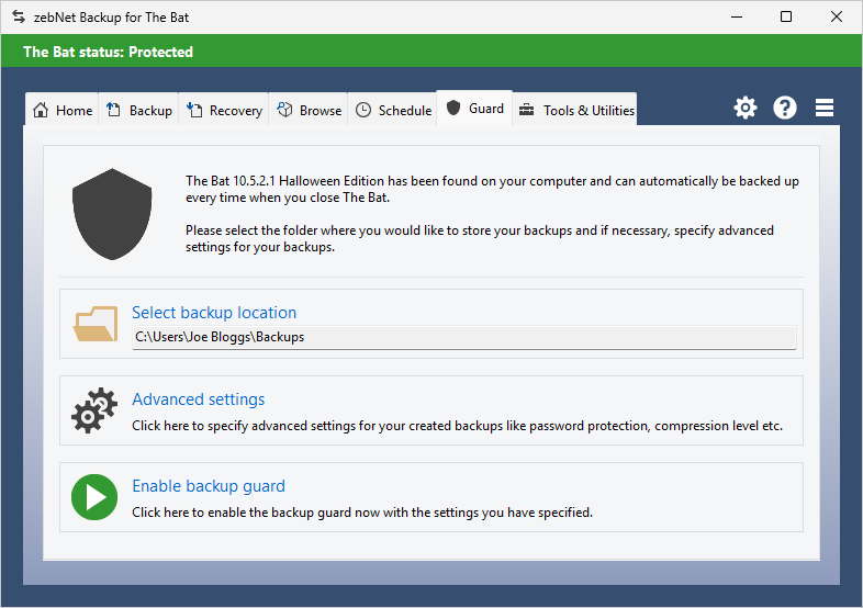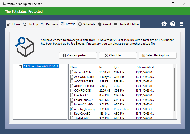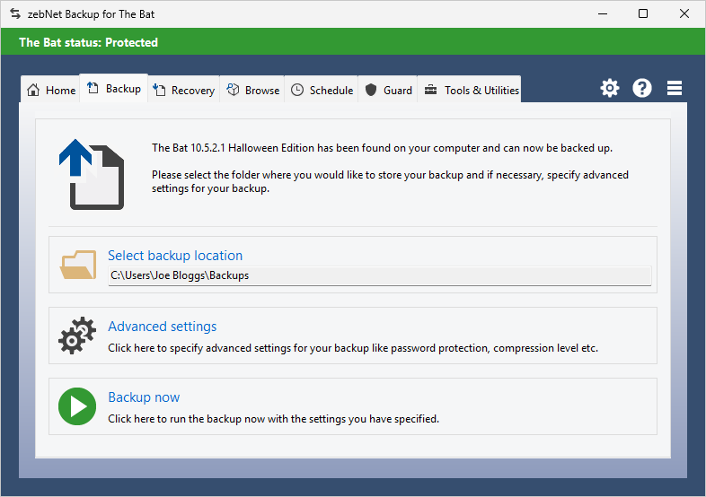 Have a look at the screenshots to get a first impression of what working with zebNet Backup for The Bat looks like. Each image is only a thumbnail and you can click on an image to enlarge it.
