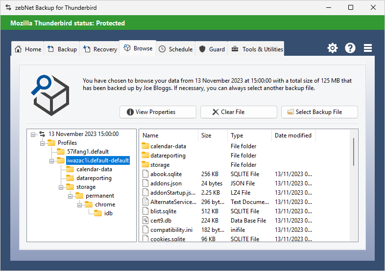 Have a look at the screenshots to get a first impression of what working with zebNet Backup for Thunderbird looks like. Each image is only a thumbnail and you can click on an image to enlarge it.