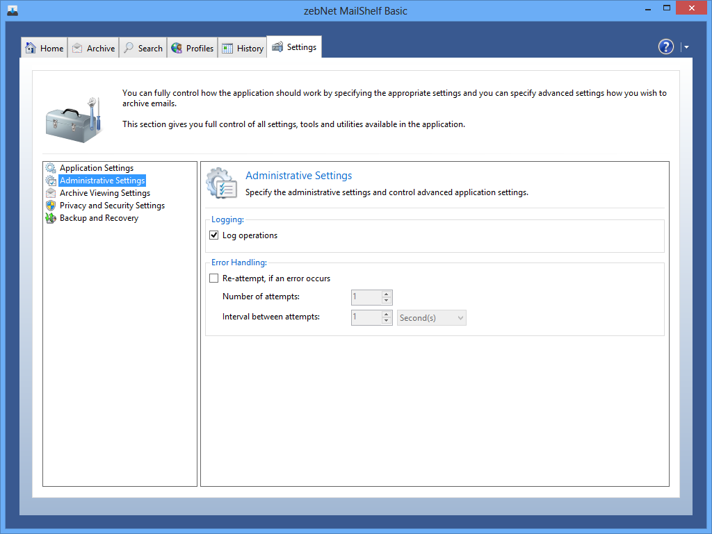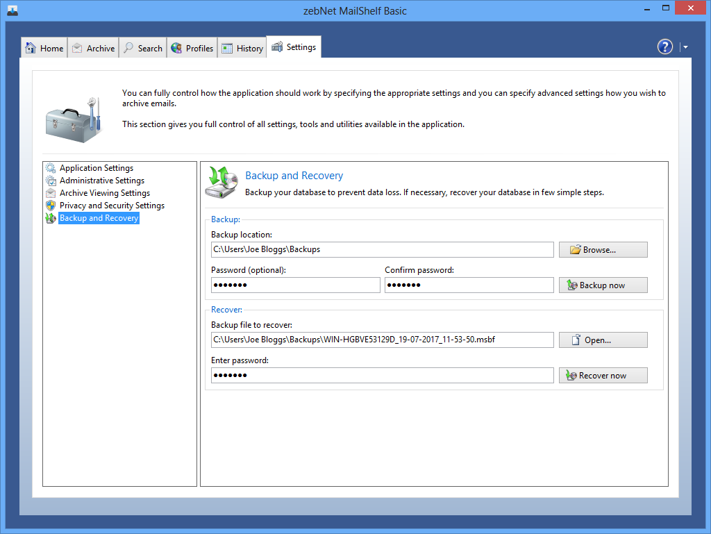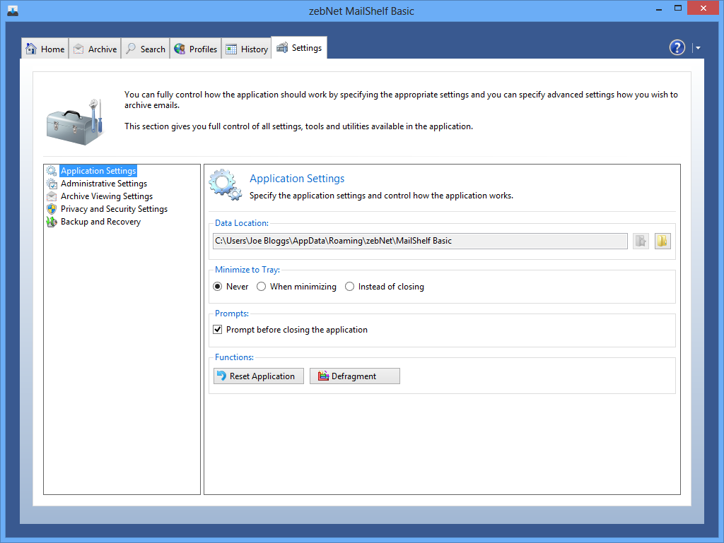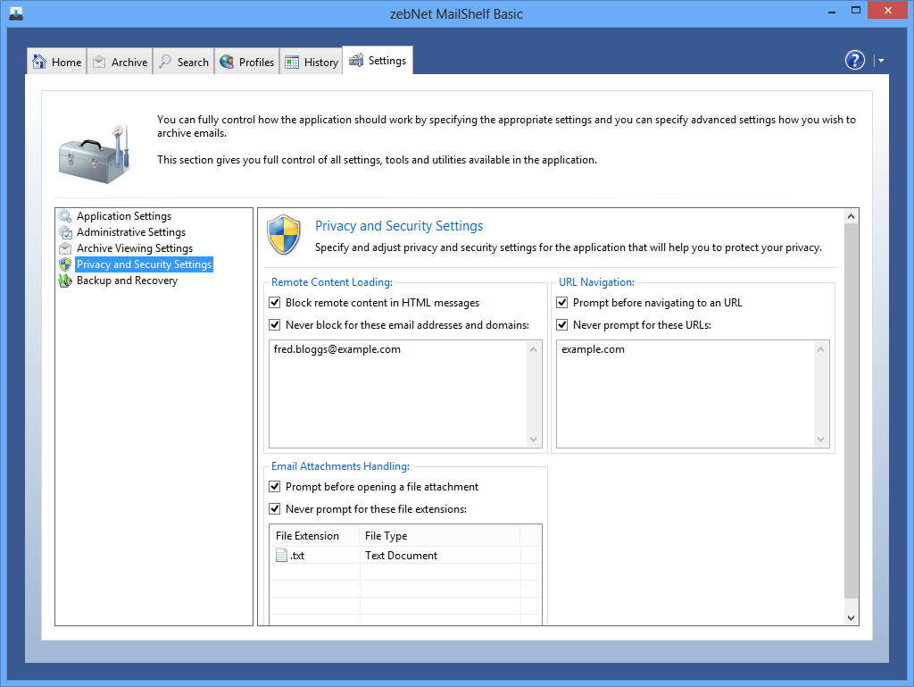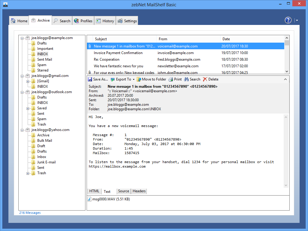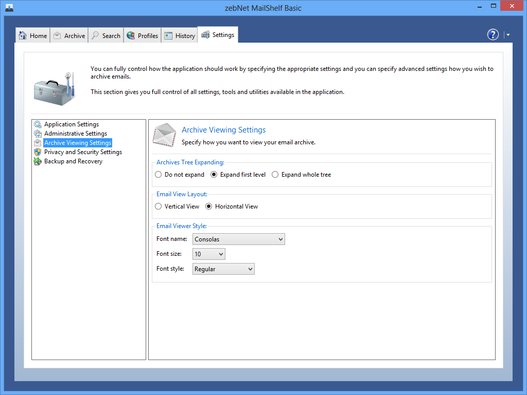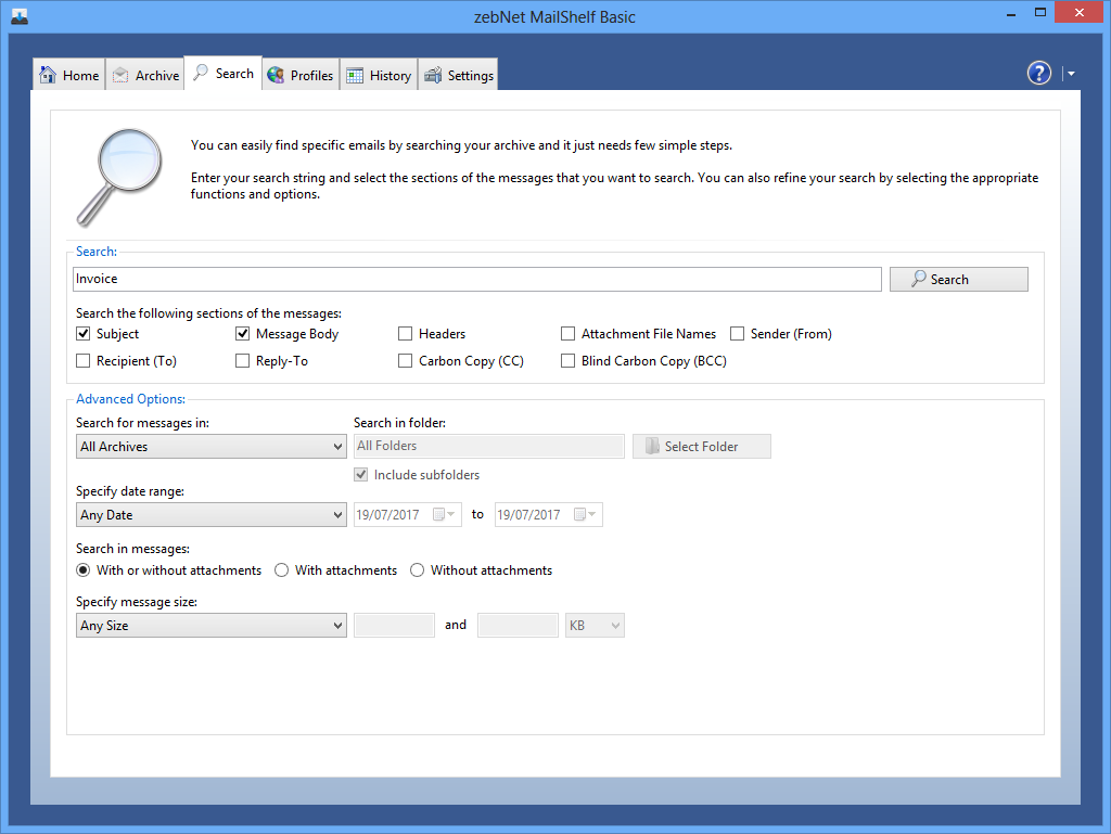 Have a look at the screenshots to get a first impression of what working with zebNet MailShelf Basic looks like. Each image is only a thumbnail and you can click on an image to enlarge it.