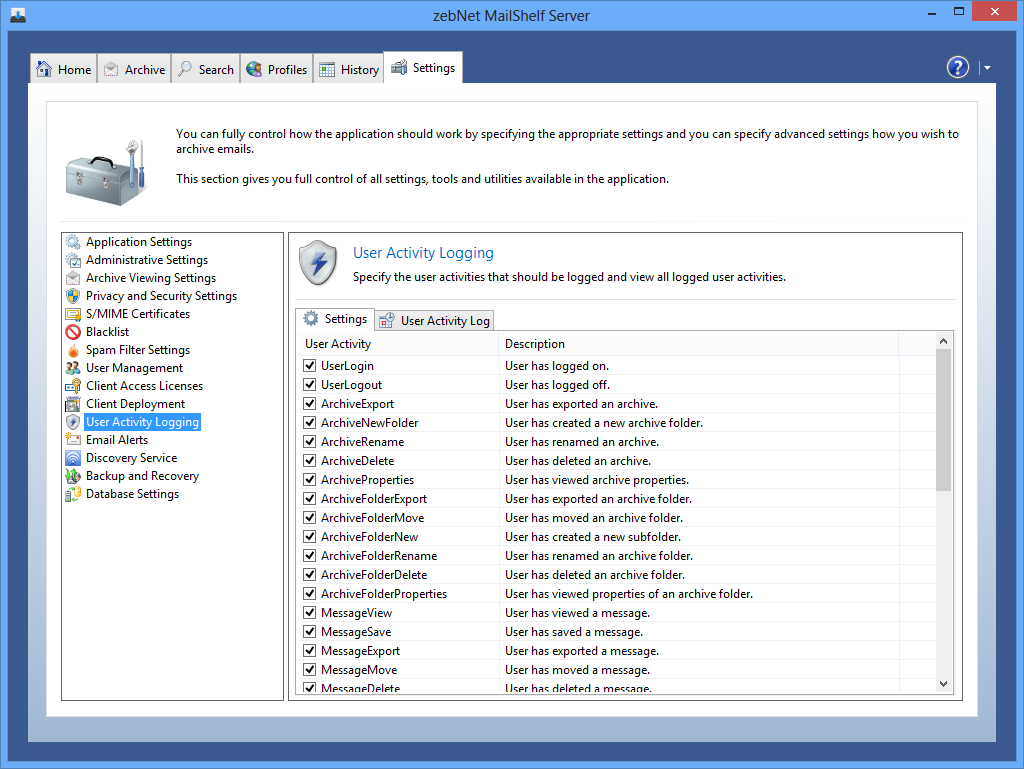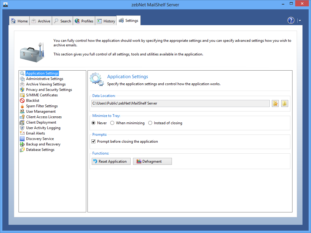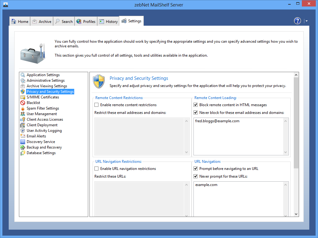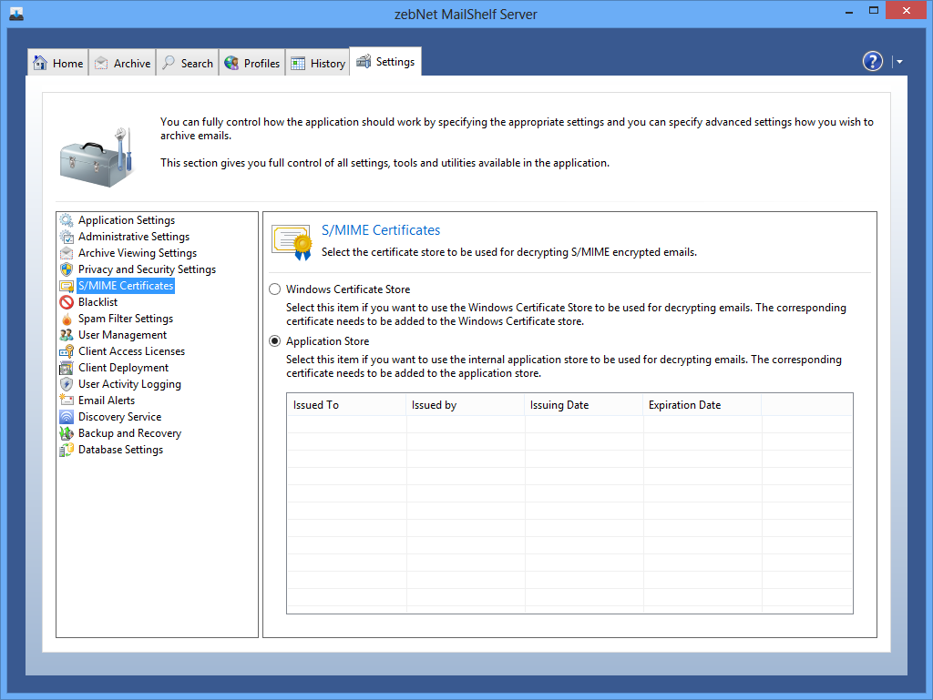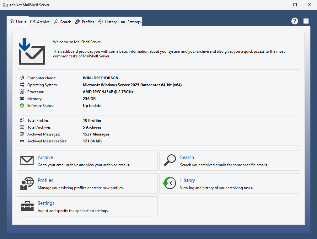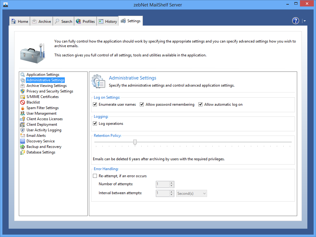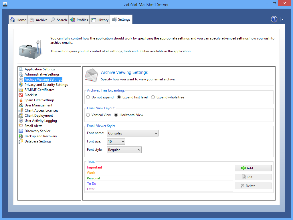 Have a look at the screenshots to get a first impression of what working with zebNet MailShelf Server looks like. Each image is only a thumbnail and you can click on an image to enlarge it.