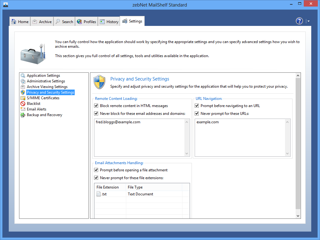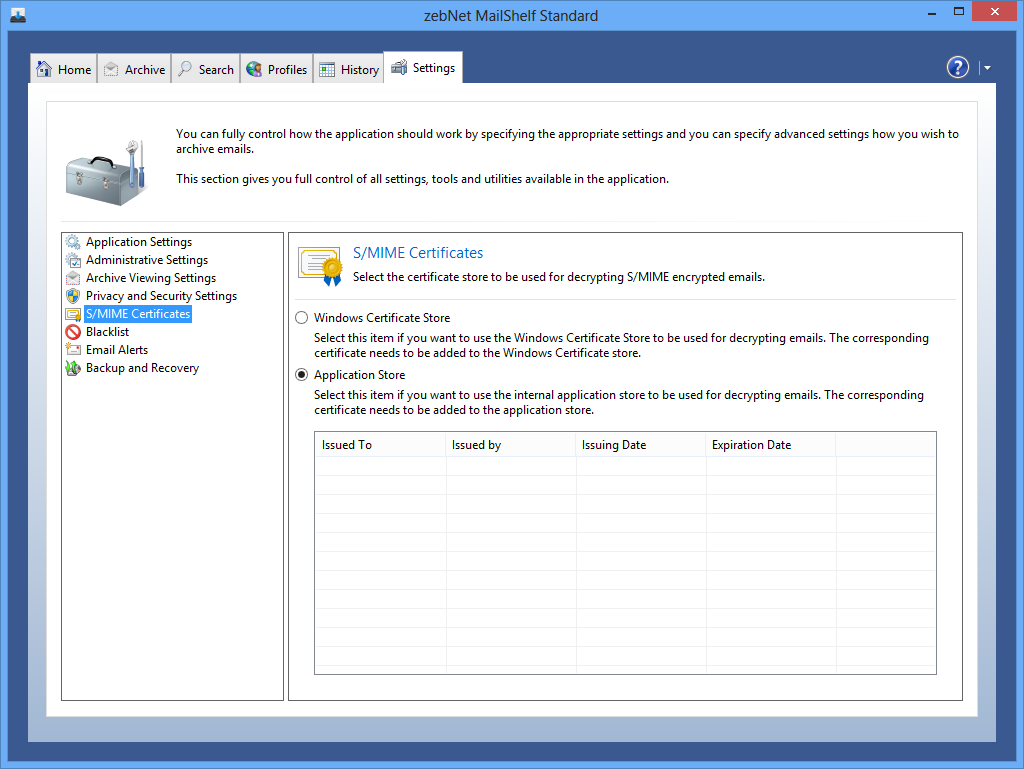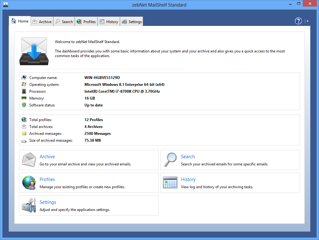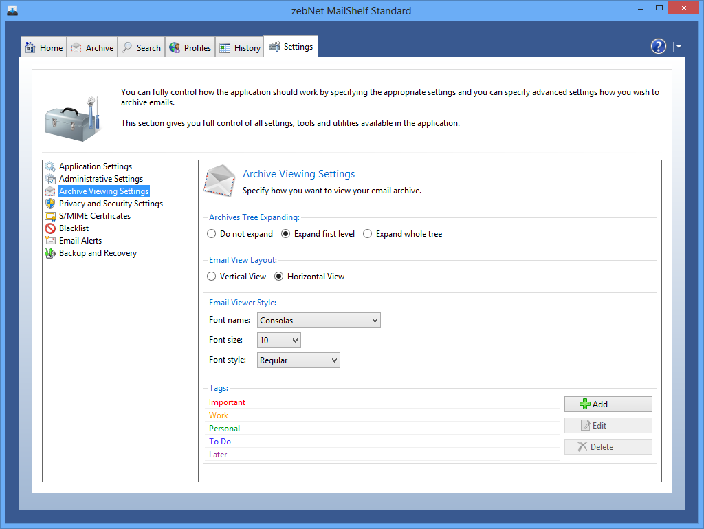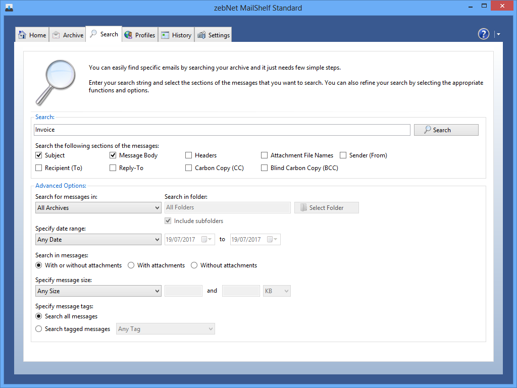 Have a look at the screenshots to get a first impression of what working with zebNet MailShelf Standard looks like. Each image is only a thumbnail and you can click on an image to enlarge it.